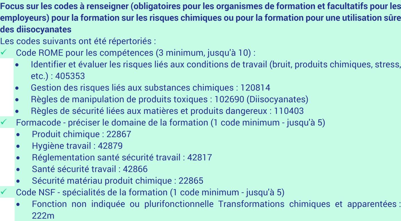 - Formacodes : éléments descriptifs de la formation permettant de préciser le domaine de la formation (voir ici)