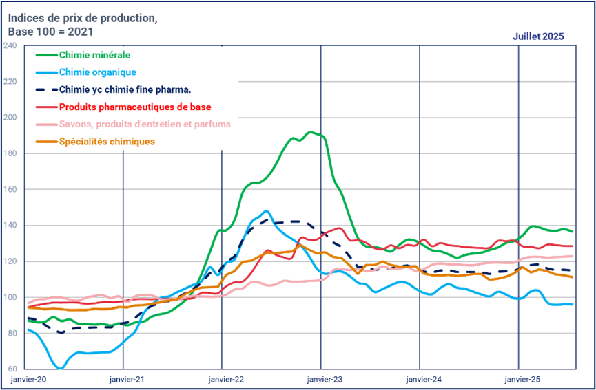 Dans un contexte de demande morose et de baisse des prix du pétrole, les prix de production de la Chimie en France se sont repliés au cours du deuxième trimestre 2025 corrigeant en partie la hausse de la période précédente (-2 % après +2,9 % en variation trimestrielle). Sur un an, ils restent en progression de 1,8 % par rapport à l’année dernière.