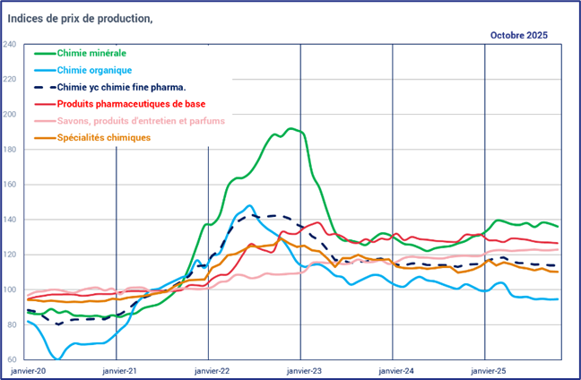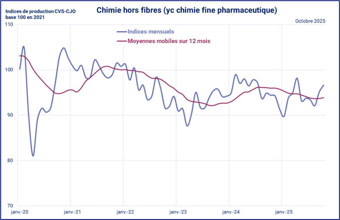 La production de la chimie de base poursuit son mouvement de repli au mois d’octobre. À l’inverse, les secteurs des spécialités chimiques et des savons, parfums et cosmétiques connaissent une amélioration de leur activité.