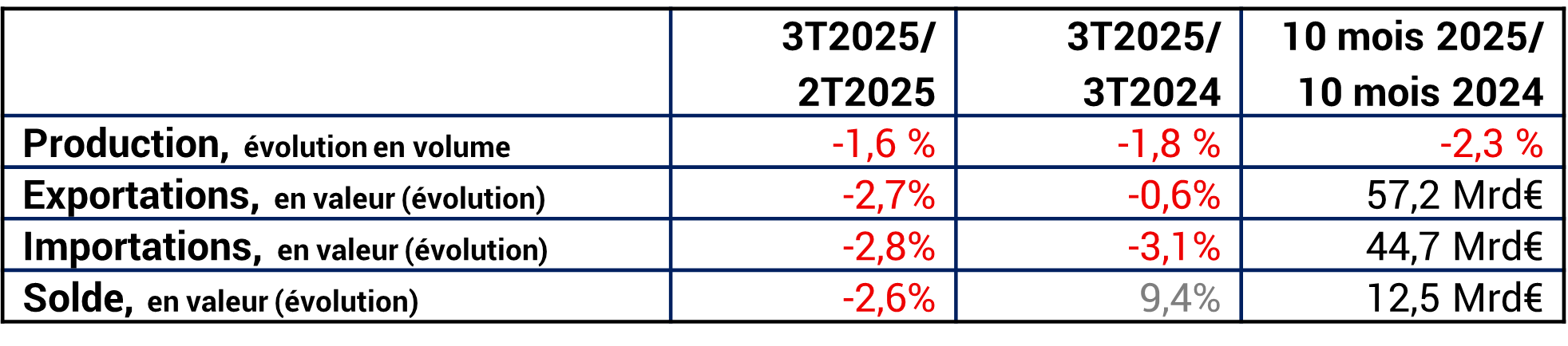 Au troisième trimestre 2025, l’activité de la chimie en France a connu un repli notable, enregistrant une baisse de 1,6% par rapport au trimestre précédent et de 1,8% sur un an. Malgré une légère amélioration des volumes en octobre, le niveau d’activité reste inférieur à celui de 2024. Ainsi, sur les neuf premiers mois de l’année, l’ensemble du secteur, y compris la chimie fine pharmaceutique, affiche un recul de 2,3% par rapport à l’année précédente, tandis que la chimie seule enregistre une baisse plus marquée de 3,8%.