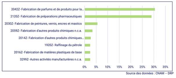En 2021, dans les entreprises de la chimie, les maladies professionnelles enregistrées sont majoritairement (93,6 %) des affections périarticulaires provoqués par certains gestes et postures au travail (tableau n° 57). Elles sont principalement observées dans les entreprises de fabrication de parfums ou de produits pour la toilette et les entreprises de fabrication de préparations pharmaceutiques (voir tableau ci-dessous). Des activités comme le conditionnement, la maintenance et la logistique peuvent être particulièrement exposantes.