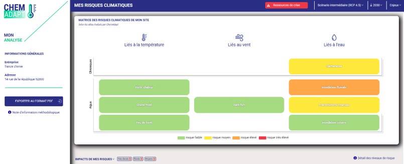 En s’appuyant sur cette méthodologie, France Chimie propose un outil simple d’utilisation à ses adhérents afin de leur permettre d’effectuer un diagnostic d’exposition au changement climatique.